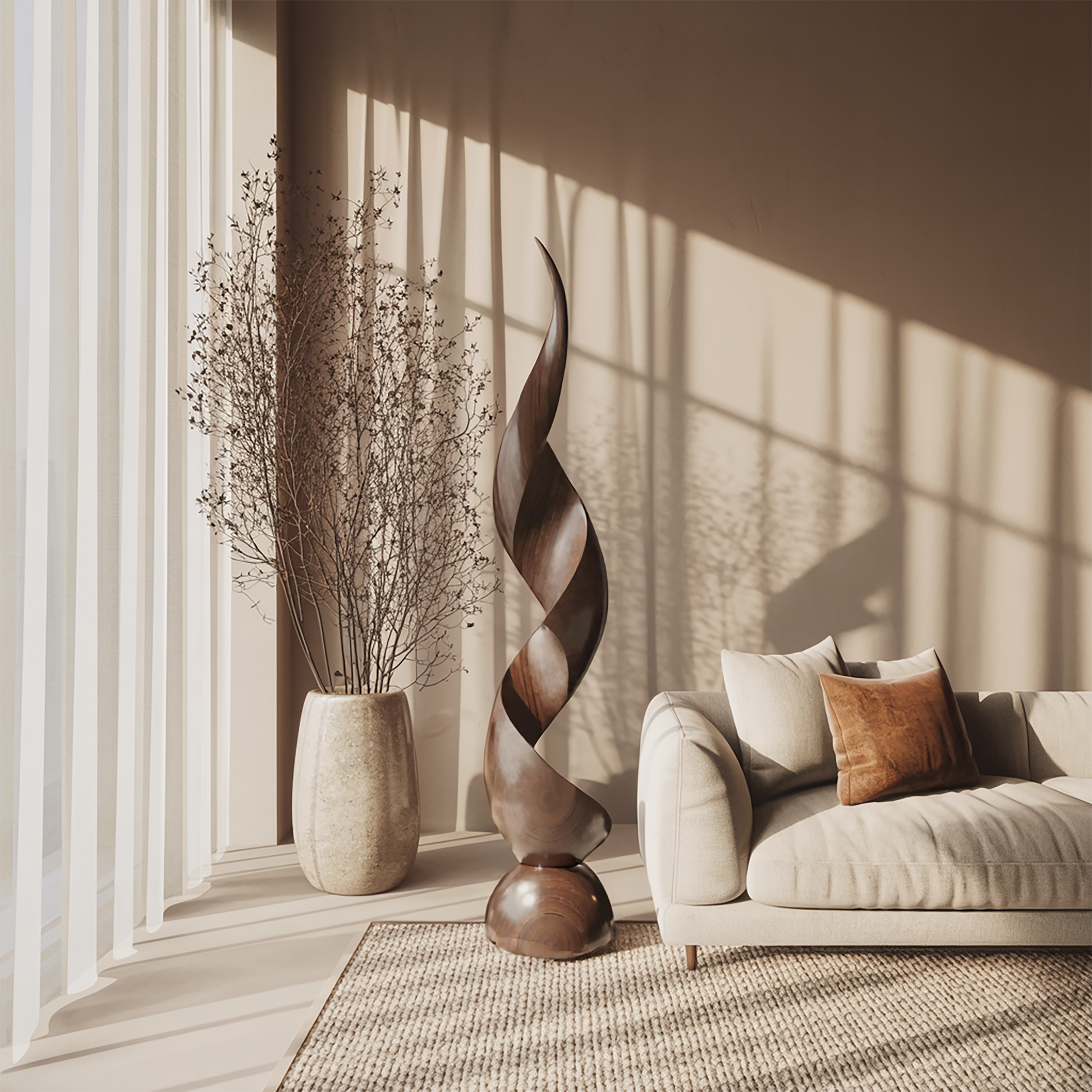 Inspired by the flowing movement of flames and the organic forms found in nature, this abstract wooden sculpture is more than just décor - it’s a visual statement. Its fluid, twisting curves evoke motion and harmony, creating a sense of energy that subtly transforms any space. Whether used as a focal point or an accent piece, it brings life and depth to minimalist, modern, and contemporary interiors.