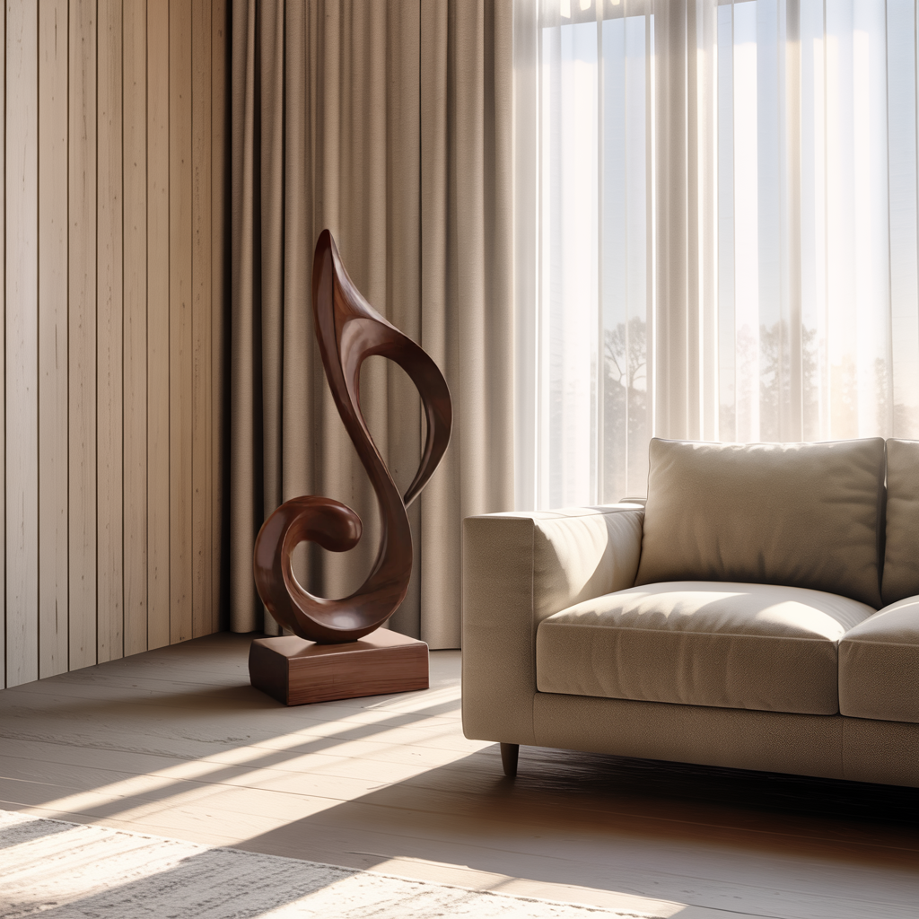 Inspired by the flowing movement of flames and the organic forms found in nature, this abstract wooden sculpture is more than just décor - it’s a visual statement. Its fluid, twisting curves evoke motion and harmony, creating a sense of energy that subtly transforms any space. Whether used as a focal point or an accent piece, it brings life and depth to minimalist, modern, and contemporary interiors.