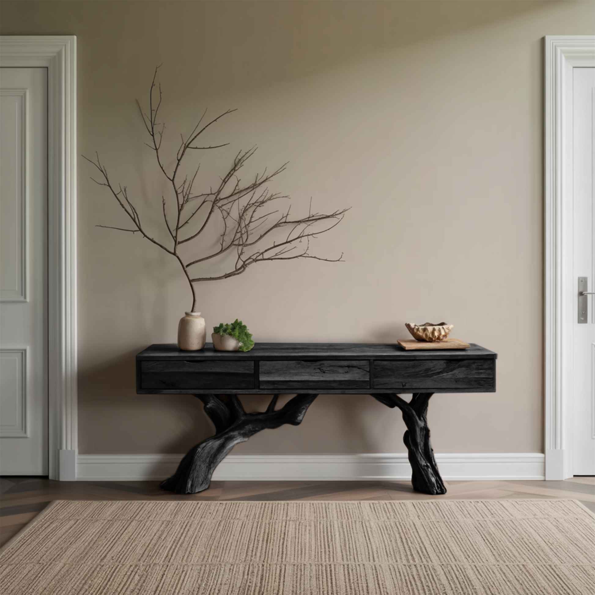 Each console table is unique, showcasing the natural beauty of solid wood through its organic grain, textures, and subtle imperfections. Every edge retains the lively character of the wood, ensuring no two pieces are ever the same. Finished with care, the surface highlights the wood’s depth and warmth—creating a centerpiece that combines practicality with understated sophistication.